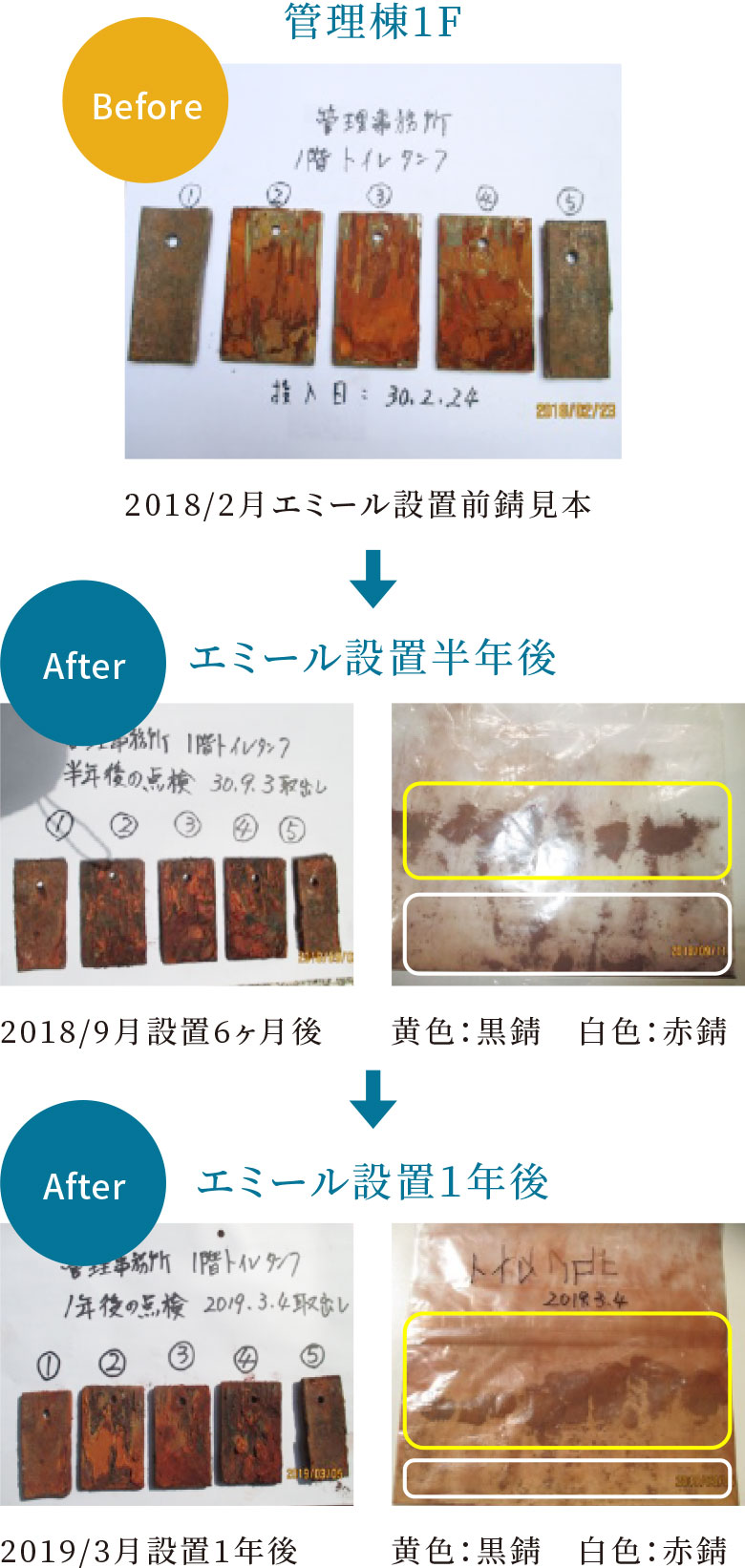 予め作成した、赤錆鉄片をトイレのロータンクに漬け込み、エミール設置半年後・1年後の錆の変化を検証した実例になります。半年後、錆の一部が黒錆化しています。(黄色い丸部分)