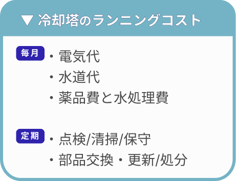 冷却塔のランニングコストは、毎月発生するものと年単位で発生するものが混在しており、全体像が見えにくいのが特徴です。