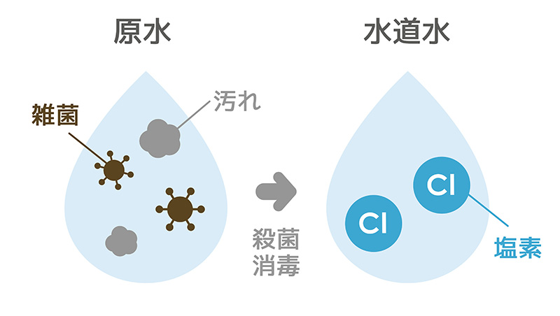 水道水に含まれる塩素は、安全な水を各家庭に届けるための消毒成分です。